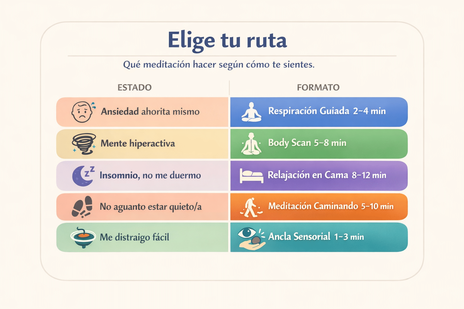 - Mente hiperactiva: body scan (5–8 min)