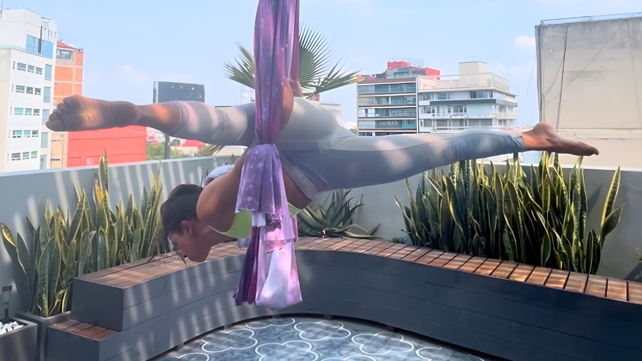 Clase multi-nivel de yoga aéreo en un columpio de tela. Realizamos posturas (asanas) y hacemos ejercicios de respiración (pranayama) que nos ayudan a relajar y fortalecer el cuerpo para reequilibrarlo física, mental y emocionalmente. Es especialmente benéfico para estirar y fortalecer el abdomen y la espalda después de largas jornadas de trabajo sentados. No es necesaria ninguna experiencia previa.