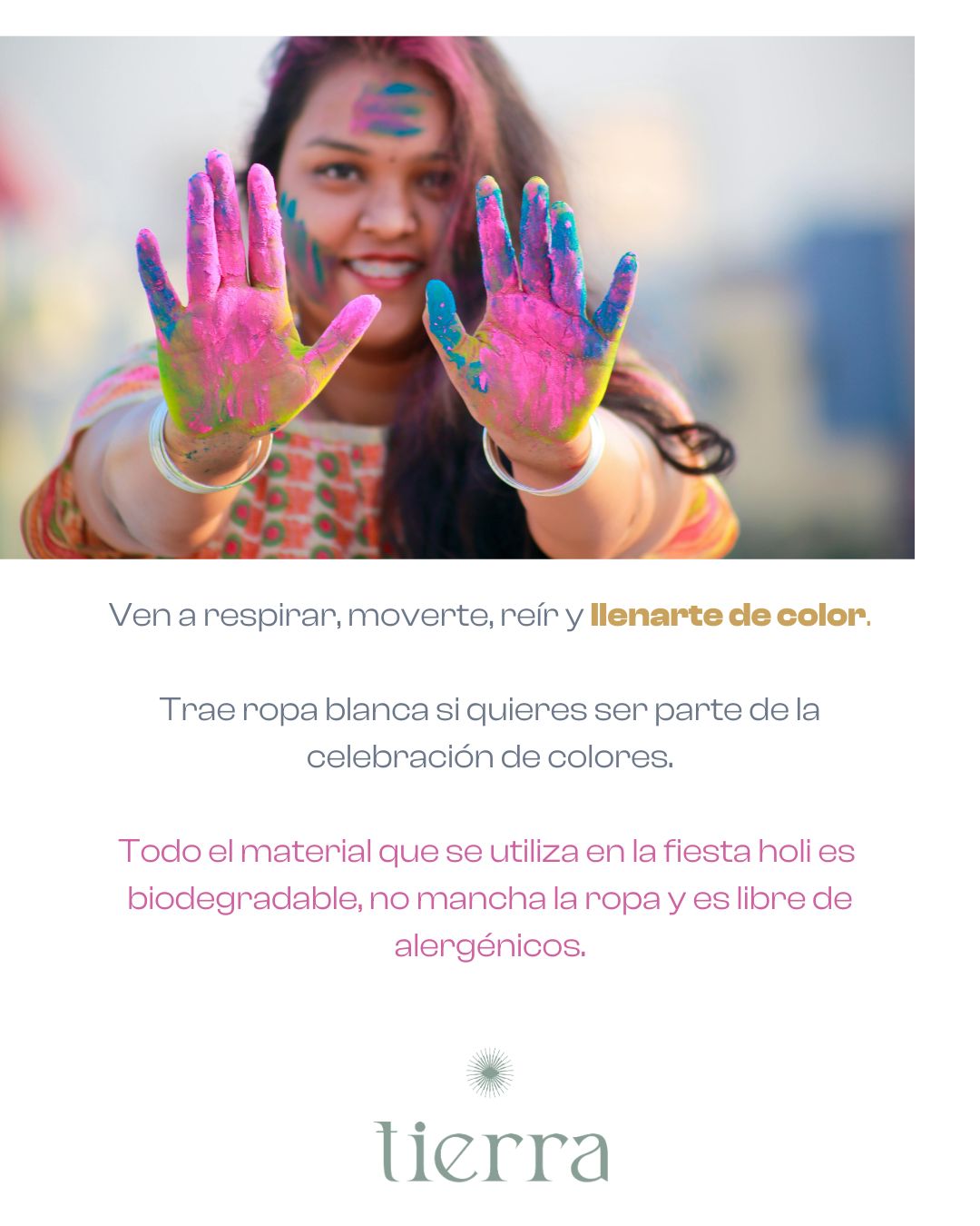 Todo el material que se utiliza en la fiesta holi es bio degradable, no mancha la ropa y es libre de alergénicos.