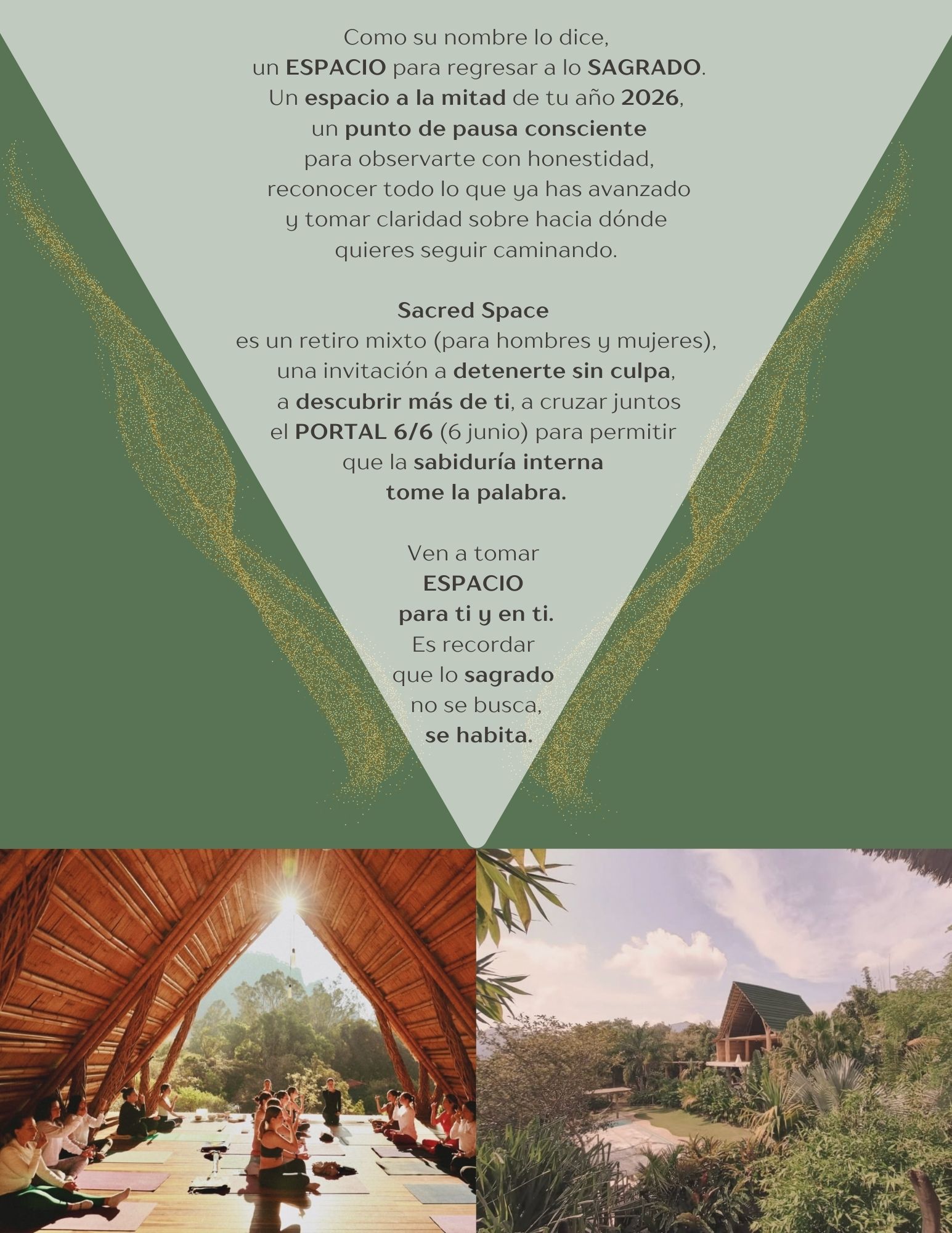 Sacred Space nace como una pausa consciente a la mitad del año: un retiro para detenerte, salir del piloto automático y regalarte un verdadero espacio sagrado para recargar tu energía, recalibrar tu brújula interna y recordar qué es lo verdaderamente esencial en tu vida. En un mundo que constantemente nos empuja a hacer más, este encuentro es una invitación a volver a lo simple, a lo presente y a lo sagrado: tu cuerpo, tu respiración, tu intención y tu conexión con algo más grande que tú.
