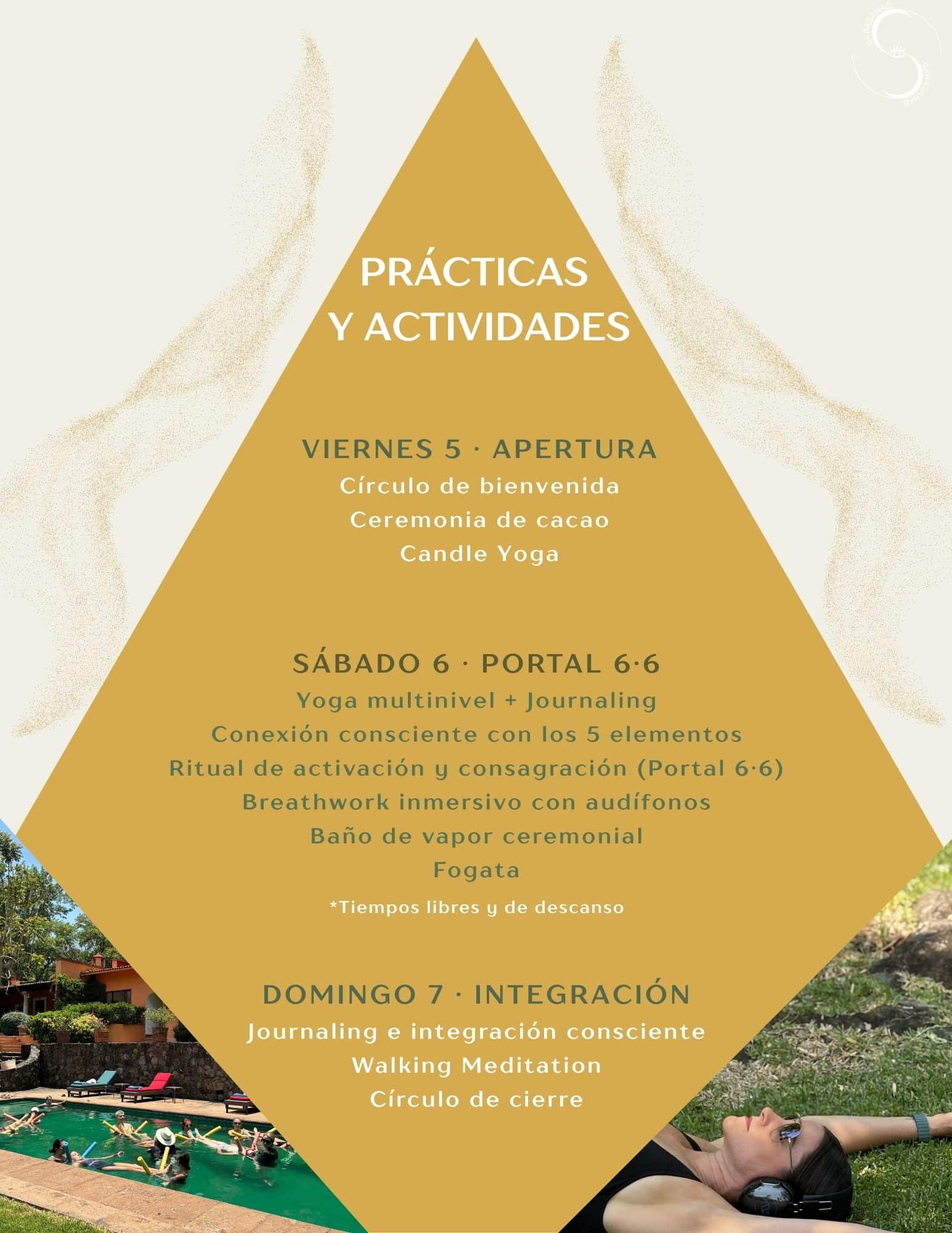 A través de yoga consciente, breathwork profundo, activaciones energéticas, rituales y espacios de integración, creamos un contenedor seguro para soltar lo que ya no resuena y realinear tu energía para la segunda mitad del año. En el corazón del retiro, el sábado, atravesaremos juntas/os la energía del portal 6:6, un momento simbólico de armonía, coherencia y alineación entre mente, cuerpo y espíritu, potenciando las intenciones que deseas sembrar.