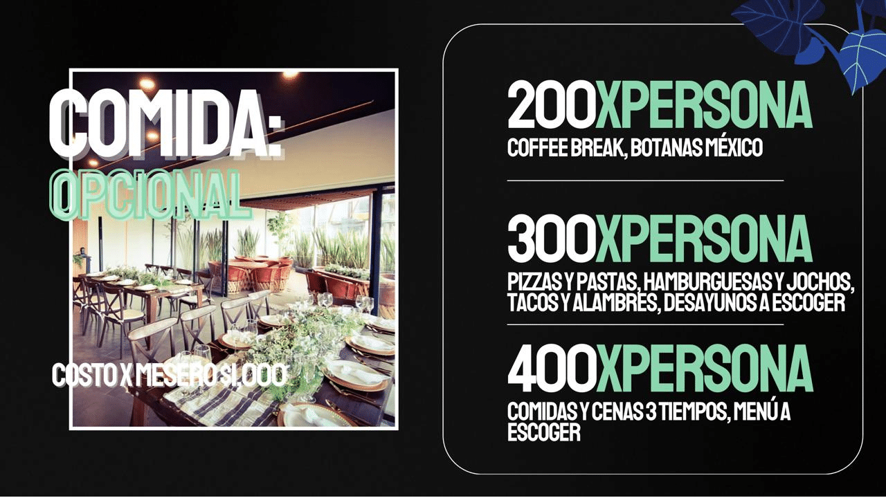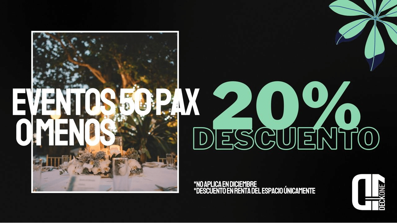 - Eventos de 50 PAX o menos con 20% de descuento (no aplica en Diciembre y descuento en renta del espacio únicamente).